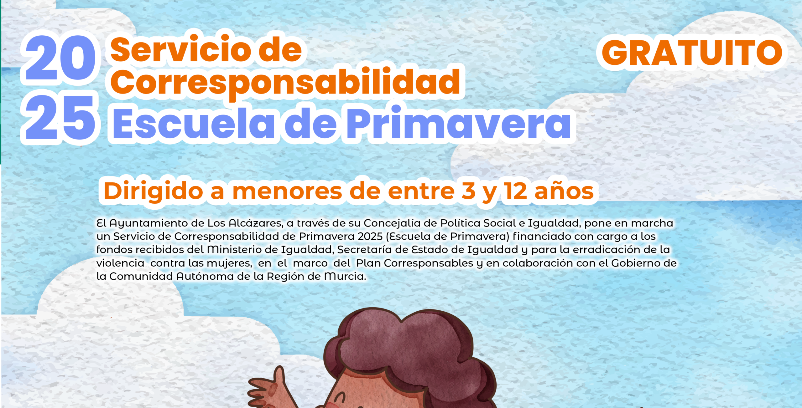 La concejalía de Política Social e Igualdad del Ayuntamiento de Los Alcázares vuelve a poner en marcha el Servicio de Corresponsabilidad de Primavera, también conocido como Escuela de Primavera 2025. Se trata de un servicio dirigido a menores de 3 a 12 años que se llevará a cabo en C.E.I.P. Al-Kazar en horario de 8.00h a 15.00h del 14 al 25 de abril, excepto sábados, domingos y festivos.