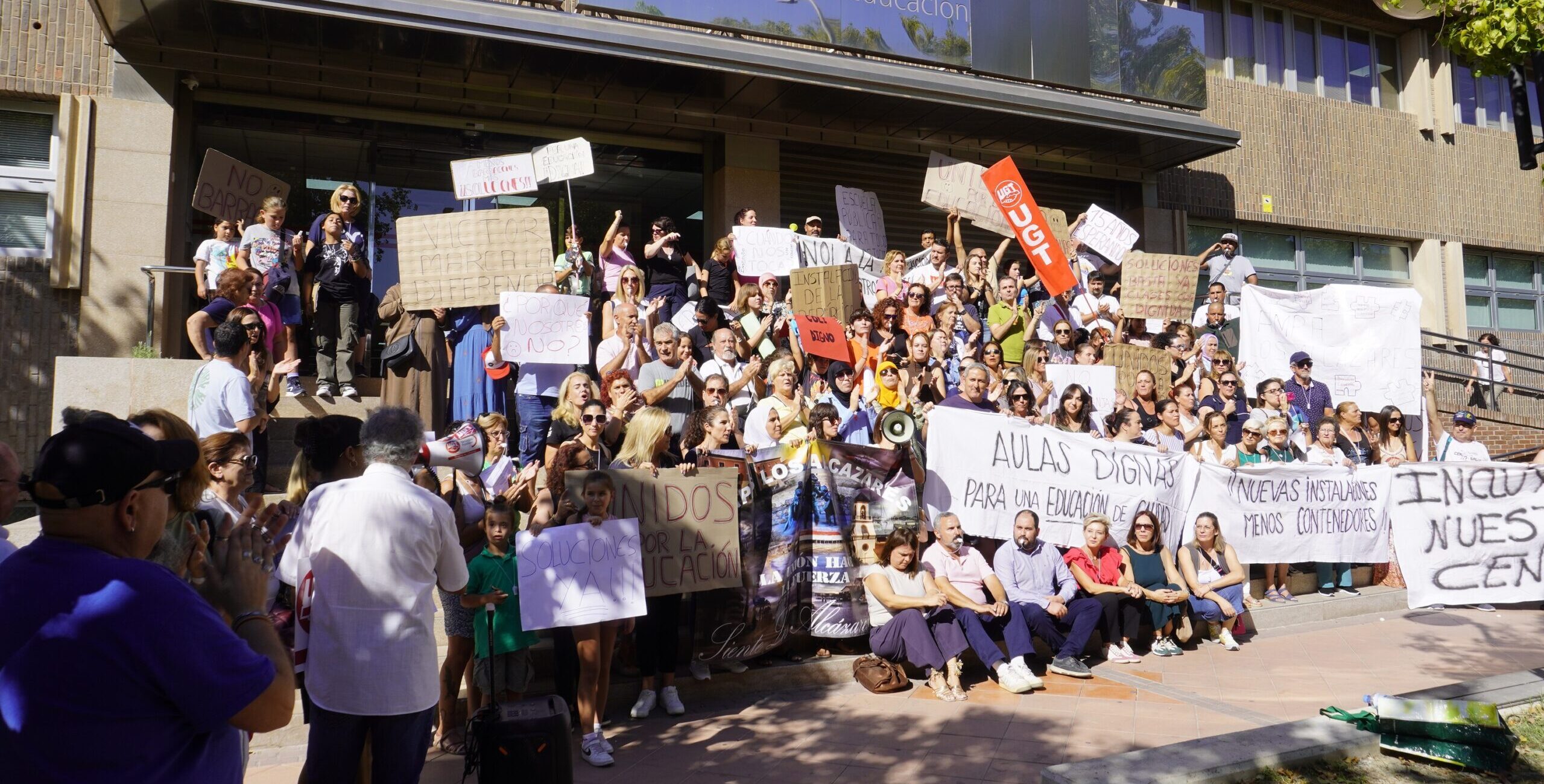 Los pitos no han cesado este viernes por la mañana en Murcia. Padres, madres, profesores, alumnos y vecinos de Los Alcázares han estado frente a la consejería de Educación para exigir mejoras inmediatas de la situación educativa que atraviesa el municipio desde hace años.